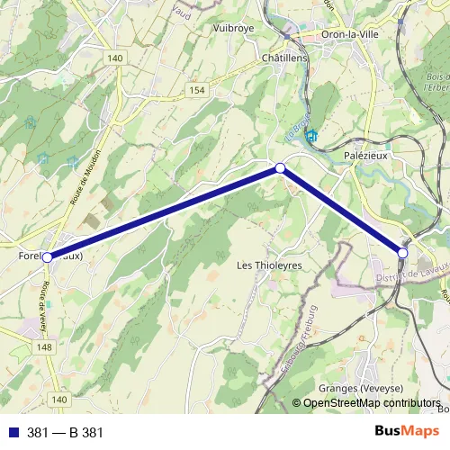 The first stop of the 381 bus route is Palézieux, gare and the last stop is Forel (Lavaux), Cornes de Cerf. 381 (B 381) is operational during on weekdays.