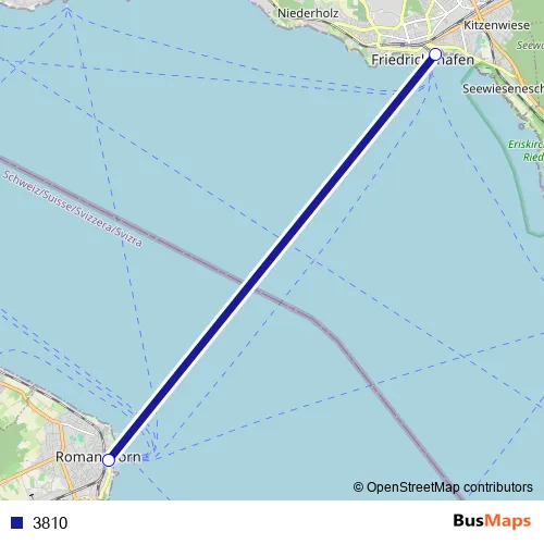 The first stop of the 3810 ferry route is Romanshorn Autoquai and the last stop is Friedrichshafen Fähre. 3810 is operational during everyday.