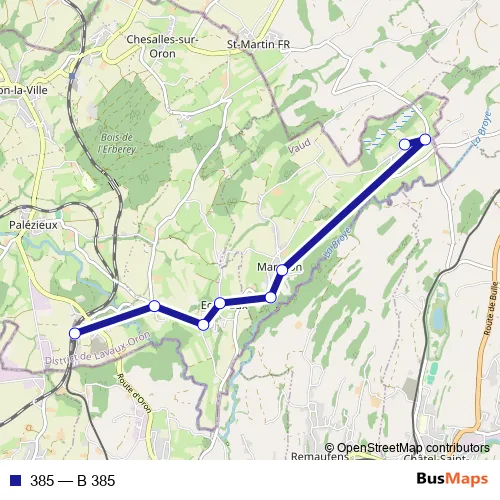 The first stop of the 385 bus route is Palézieux, gare and the last stop is La Rogivue. 385 (B 385) is operational during everyday.