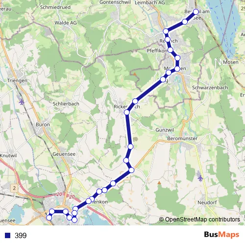 The first stop of the 399 bus route is Beinwil am See, Bahnhof and the last stop is Sursee, Bahnhof. 399 is operational during everyday.