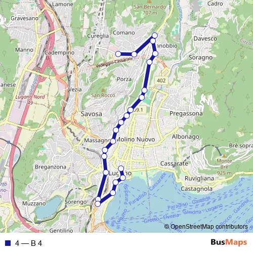 See why over 2 million users trust and consider busmaps.com as the best public transport website. busmaps gives you Lugano Buses suggested routes, real-time bus tracker, line route maps in Lugano, and helps to find the closest 4 bus stops near you. No internet available? Download an offline PDF map and bus schedule for the 4 bus to take on your trip.