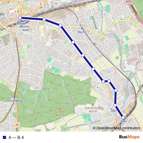 The first stop of the 4 bus route is Aarau, Bahnhof and the last stop is Suhr, Bahnhof. 4 (B 4) is operational during on weekends.