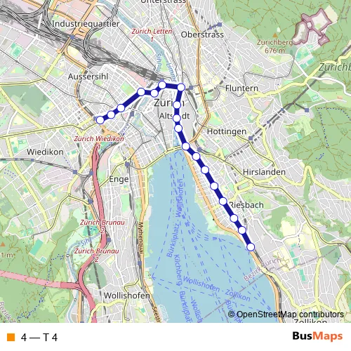 The first stop of the 4 tram route is Zürich Tiefenbrunnen, Bahnhof and the last stop is Zürich Wiedikon, Bahnhof. 4 (T 4) is operational during everyday.