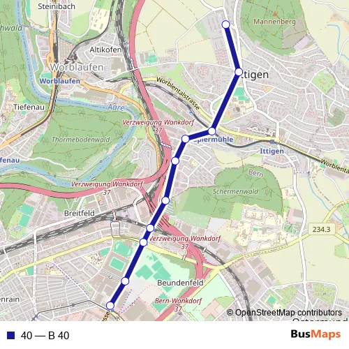 The first stop of the 40 bus route is Ittigen, Kappelisacker and the last stop is Bern, Guisanplatz Expo. 40 (B 40) is operational during on weekends.
