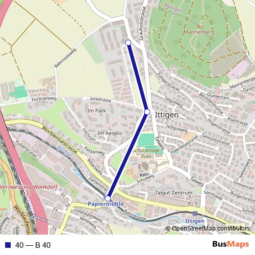 The first stop of the 40 bus route is Papiermühle, Bahnhof and the last stop is Ittigen, Kappelisacker. 40 (B 40) is operational during everyday.