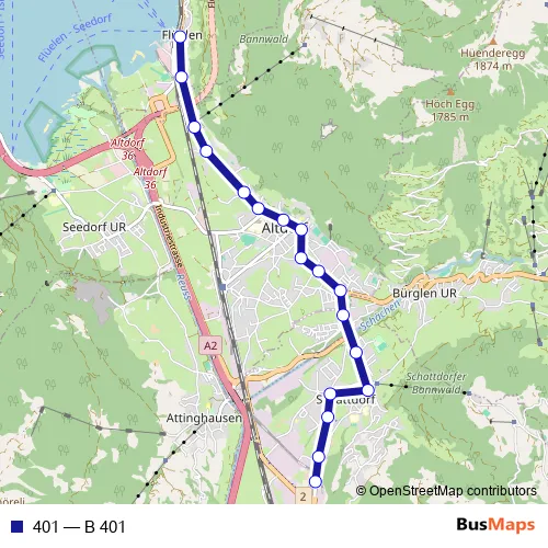 The first stop of the 401 bus route is Schattdorf, Rossgiessen and the last stop is Flüelen, Hauptplatz. 401 (B 401) is operational during everyday.
