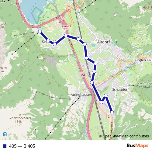 The first stop of the 405 bus route is Seedorf UR, Schloss A Pro and the last stop is Schattdorf, Rossgiessen. 405 (B 405) is operational during on weekdays.