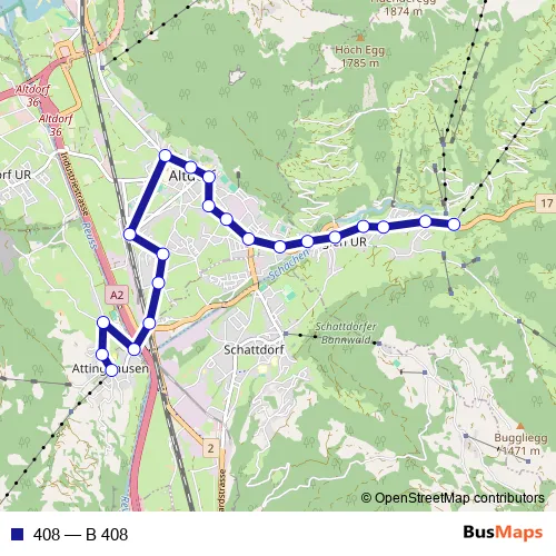 The first stop of the 408 bus route is Brügg (Bürglen Ur) and the last stop is Attinghausen, Seilbahn. 408 (B 408) is operational during on weekdays.
