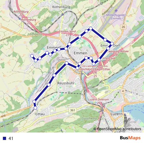 The first stop of the 41 bus route is Emmenbrücke, Schönbühl and the last stop is Luzern Littau, Bahnhof. 41 is operational during everyday.