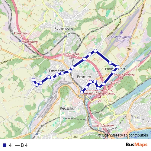 The first stop of the 41 bus route is Emmenbrücke, Bahnhof Süd and the last stop is Emmenbrücke, Schönbühl. 41 (B 41) is operational during everyday.