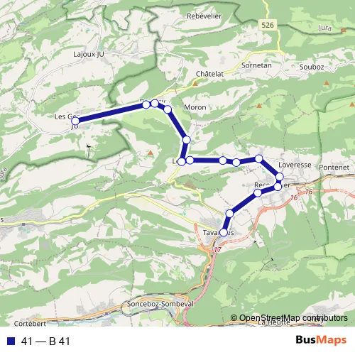 The first stop of the 41 bus route is Les Genevez JU, poste and the last stop is Tavannes, gare. 41 (B 41) is operational during on weekdays.