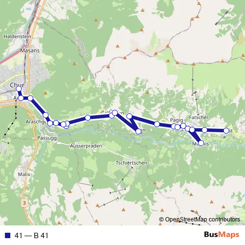 See why over 2 million users trust and consider busmaps.com as the best public transport website. busmaps gives you Chur Buses suggested routes, real-time bus tracker, line route maps in Chur, and helps to find the closest 41 bus stops near you. No internet available? Download an offline PDF map and bus schedule for the 41 bus to take on your trip.