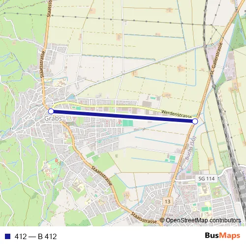 The first stop of the 412 bus route is Grabs, Post and the last stop is Grabs, Industrie. 412 (B 412) is operational during everyday.