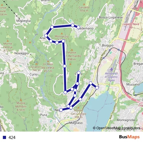 The first stop of the 424 bus route is Agno, Stazione and the last stop is Cademario, Kurhaus. 424 is operational during everyday.