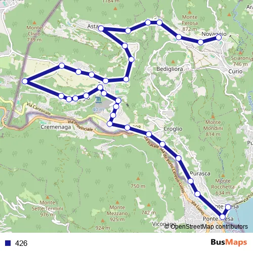 The first stop of the 426 bus route is Novaggio, Posta and the last stop is Ponte Tresa, Stazione. 426 is operational during everyday.