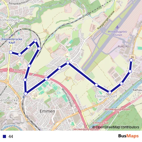 The first stop of the 44 bus route is Emmenbrücke, Bösfeld and the last stop is Emmen, Flugzeugwerke. 44 is operational during everyday.