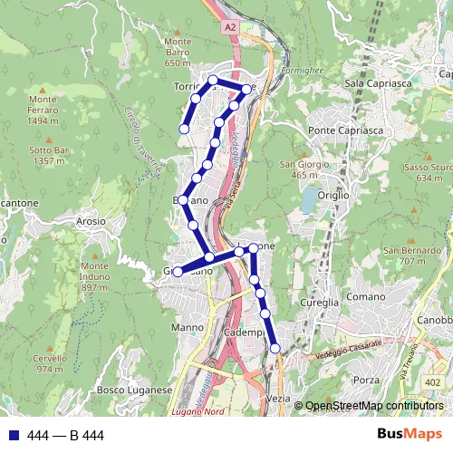 The first stop of the 444 bus route is Torricella, Naravazz and the last stop is Cadempino, Ronchetto. 444 (B 444) is operational during everyday.