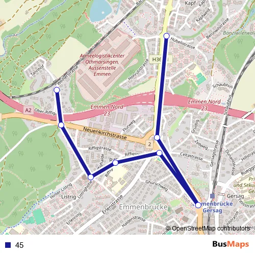 The first stop of the 45 bus route is Emmenbrücke, Chörbli and the last stop is Emmenbrücke, Bösfeld. 45 is operational during everyday.