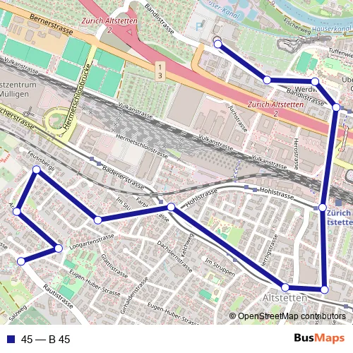 See why over 2 million users trust and consider busmaps.com as the best public transport website. busmaps gives you Zuerich Buses suggested routes, real-time bus tracker, line route maps in Zuerich, and helps to find the closest 45 bus stops near you. No internet available? Download an offline PDF map and bus schedule for the 45 bus to take on your trip.