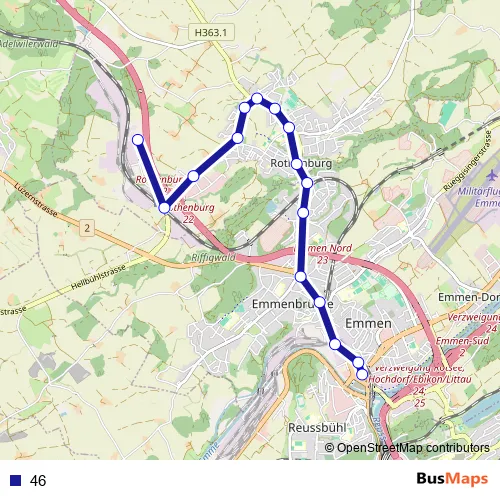 The first stop of the 46 bus route is Rothenburg, Wahligen Nord and the last stop is Emmenbrücke, Bahnhof Süd. 46 is operational during everyday.