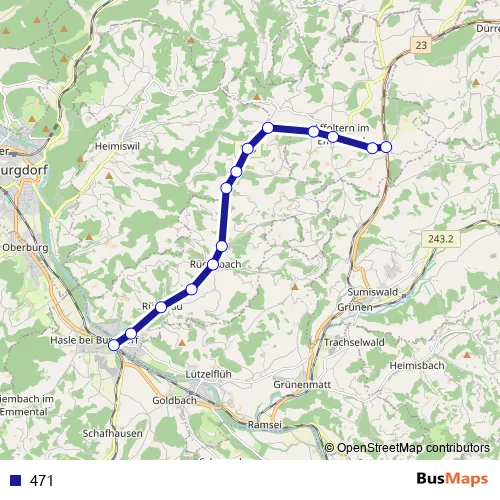 The first stop of the 471 bus route is Affoltern-Weier, Bahnhof and the last stop is Hasle-Rüegsau, Bahnhof. 471 is operational during everyday.