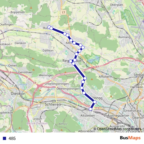 The first stop of the 485 bus route is Zürich Altstetten, Bahnhof N and the last stop is Buchs ZH, Linde. 485 is operational during everyday.