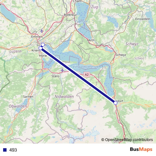 The first stop of the 493 bus route is Luzern, Bahnhof and the last stop is Altdorf UR, Bahnhof West. 493 is operational during everyday.
