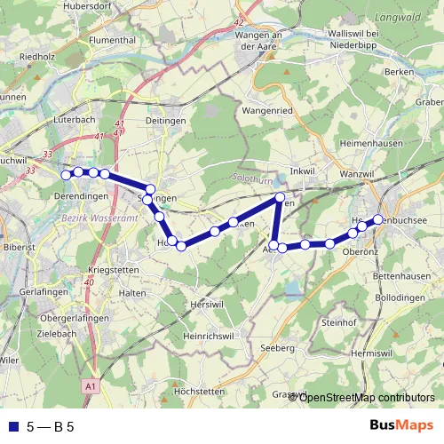 The first stop of the 5 bus route is Derendingen, Kreuzplatz and the last stop is Herzogenbuchsee, Bahnhof. 5 (B 5) is operational during everyday.