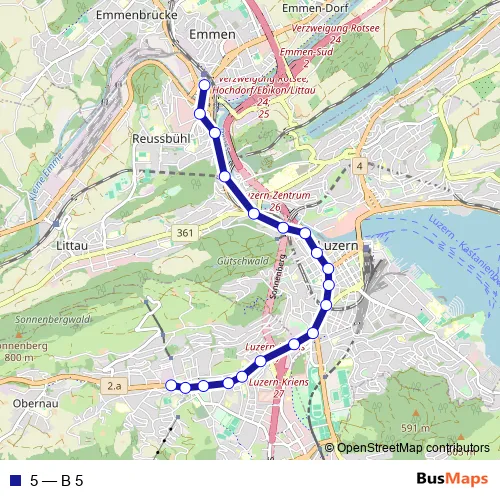 The first stop of the 5 bus route is Emmenbrücke, Bahnhof Süd and the last stop is Kriens, Busschleife. 5 (B 5) is operational during everyday.