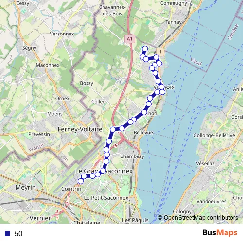 The first stop of the 50 bus route is Versoix, Centre sportif and the last stop is Genève-Aéroport, Terminal. 50 is operational during everyday.