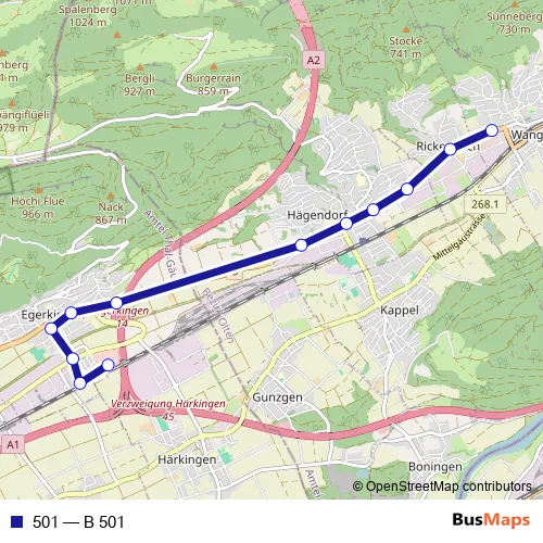 The first stop of the 501 bus route is Wangen b. Olten, Kleider Frey and the last stop is Egerkingen, Gäu Park. 501 (B 501) is operational during everyday.
