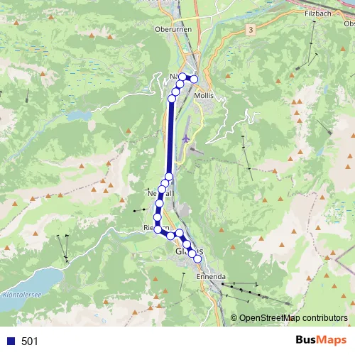 The first stop of the 501 bus route is Näfels-Mollis, Bahnhof and the last stop is Glarus, Bahnhof. 501 is operational during everyday.