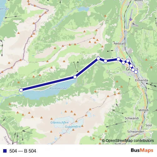 The first stop of the 504 bus route is Glarus, Bahnhof and the last stop is Klöntal, Vorauen. 504 (B 504) is operational during on weekends.