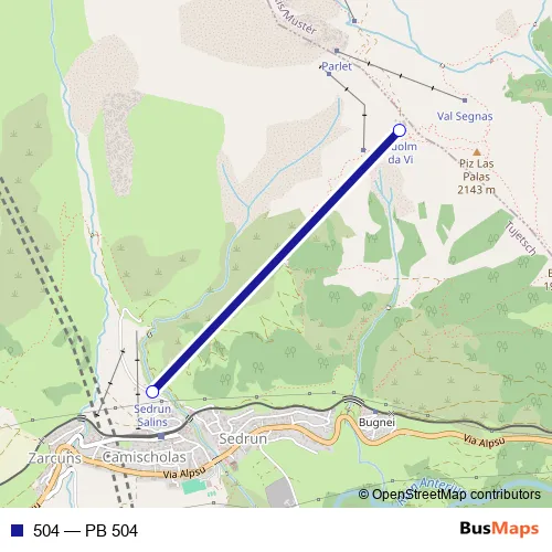 The first stop of the 504 cable-car route is Cuolm da Vi and the last stop is Sedrun Salins (pendiculara). 504 (PB 504) is operational during everyday.