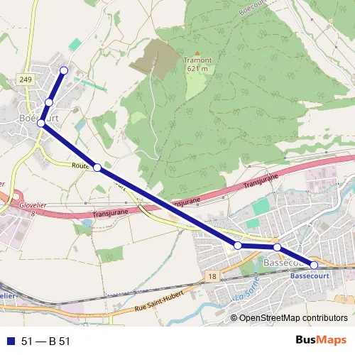The first stop of the 51 bus route is Boécourt, collège and the last stop is Bassecourt, gare. 51 (B 51) is operational during on weekdays.