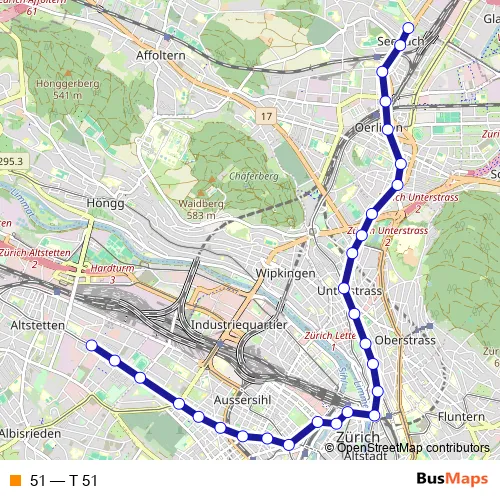 See why over 2 million users trust and consider busmaps.com as the best public transport website. busmaps gives you Zuerich Trams suggested routes, real-time bus tracker, line route maps in Zuerich, and helps to find the closest 51 tram stops near you. No internet available? Download an offline PDF map and bus schedule for the 51 tram to take on your trip.