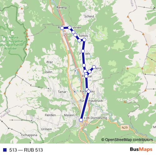 The first stop of the 513 bus route is Rothenbrunnen, Bahnhof and the last stop is Thusis, Bahnhof. 513 (RUB 513) is operational during on weekends.