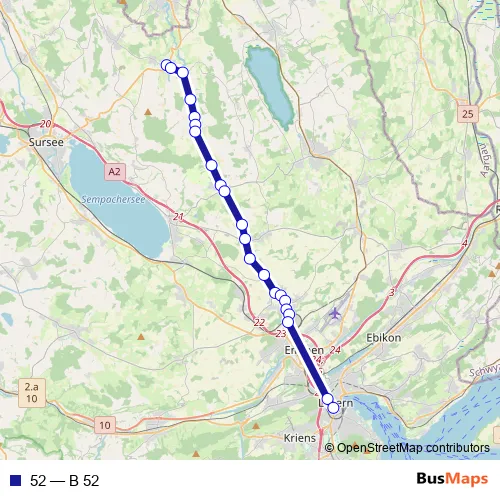 See why over 2 million users trust and consider busmaps.com as the best public transport website. busmaps gives you Luzern Buses suggested routes, real-time bus tracker, line route maps in Luzern, and helps to find the closest 52 bus stops near you. No internet available? Download an offline PDF map and bus schedule for the 52 bus to take on your trip.