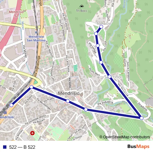 The first stop of the 522 bus route is Salorino, Somazzo Paese and the last stop is Mendrisio, Stazione. 522 (B 522) is operational during everyday.