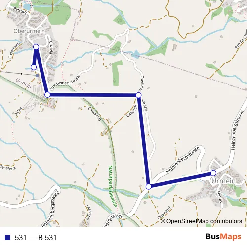 The first stop of the 531 bus route is Oberurmein, Skilift and the last stop is Urmein, Dorf. 531 (B 531) is operational during on weekends.