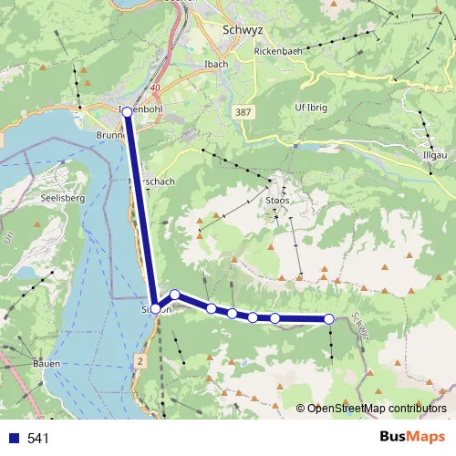 The first stop of the 541 bus route is Riemenstalden, Chäppeliberg and the last stop is Brunnen, Bahnhof. 541 is operational during everyday.