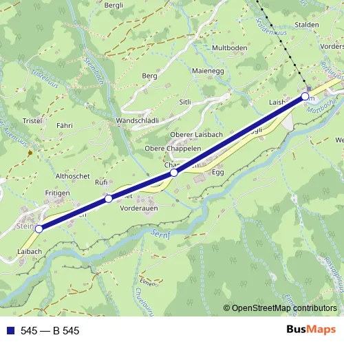 The first stop of the 545 bus route is Elm, Steinibach and the last stop is Elm, Sportbahnen. 545 (B 545) is operational during everyday.