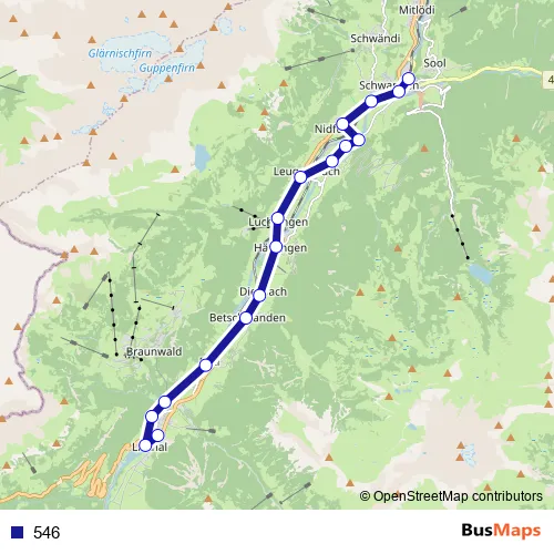 The first stop of the 546 bus route is Linthal, Post and the last stop is Schwanden GL, Bahnhof. 546 is operational during on weekdays.