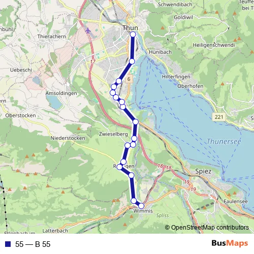 The first stop of the 55 bus route is Wimmis, Bahnhof and the last stop is Thun, Bahnhof. 55 (B 55) is operational during everyday.