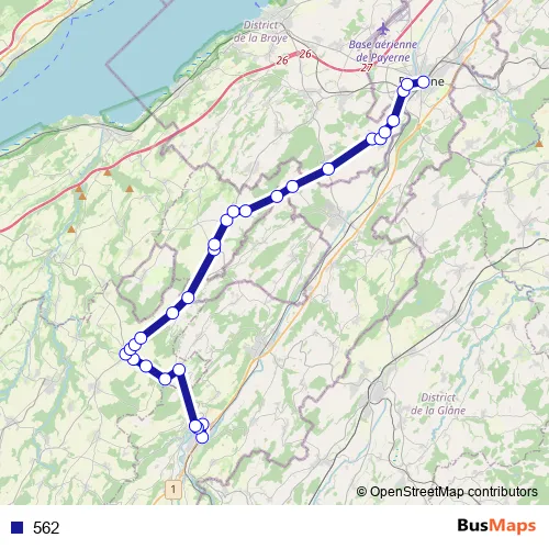 The first stop of the 562 bus route is Moudon, gare and the last stop is Payerne, gare. 562 is operational during everyday.