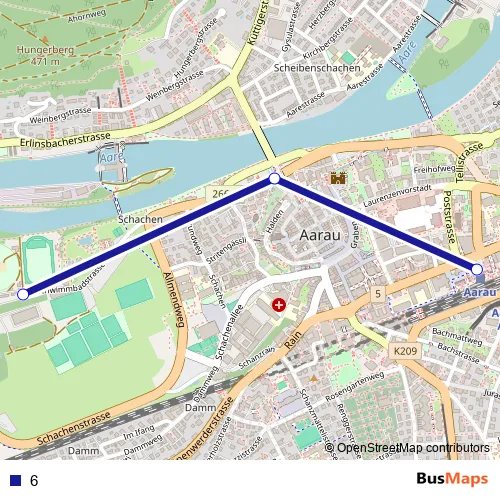 The first stop of the 6 bus route is Aarau, Sportanlagen Schachen and the last stop is Aarau, Bahnhof. 6 is operational during everyday.