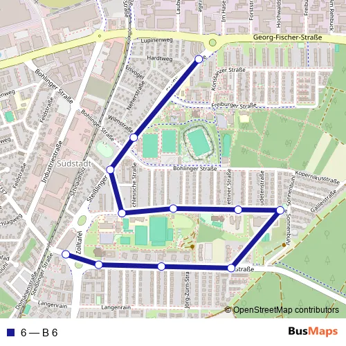 The first stop of the 6 bus route is Singen (Htw), Berliner Platz and the last stop is Singen (Htw), Steisslinger Str. 6 (B 6) is operational during everyday.