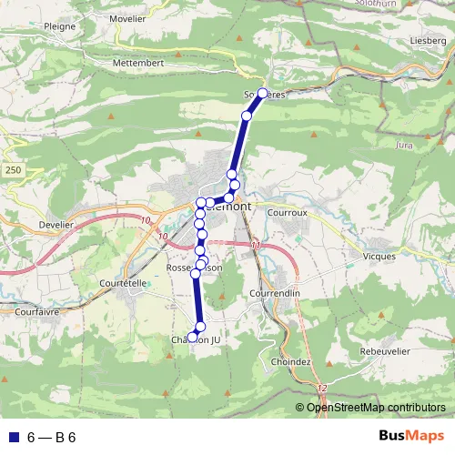 The first stop of the 6 bus route is Soyhières, place de la Liberté and the last stop is Châtillon JU, haut du village. 6 (B 6) is operational during everyday.