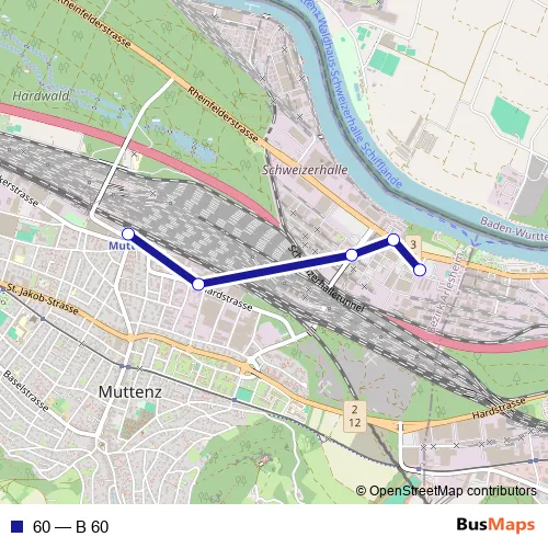 The first stop of the 60 bus route is Muttenz, Industriepark and the last stop is Muttenz, Bahnhof. 60 (B 60) is operational during on weekdays.