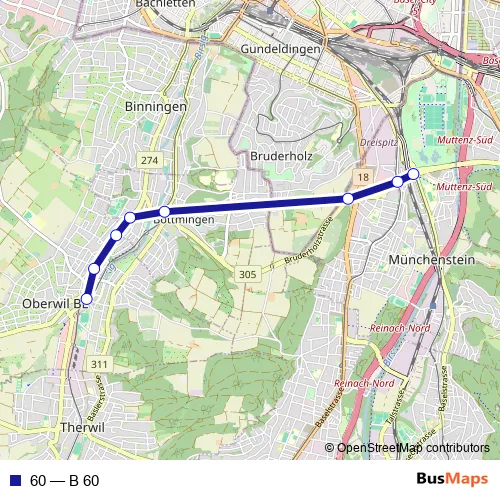 The first stop of the 60 bus route is Münchenstein, Neuewelt and the last stop is Oberwil BL, Zentrum. 60 (B 60) is operational during on weekends.